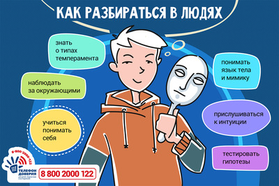 В популярной игре «Мафия» игроки в роли мафиози врут и притворяются, чтобы их не вычислили, а их противники в роли мирных жителей пытаются распознать бандитов среди горожан, стараясь не устранить по ошибке своего. Для этого приходится пристально наблюдать за участниками, их мимикой, жестами, следить за разговорами. От умения вовремя обнаружить ложь или скрытый мотив зависит результат игры. В жизни, как и в игре, очень полезны навыки, помогающие распознавать «своих» и «чужих», отличать правду от лжи, опасность от защищенности. Именно этих навыков часто не хватает тем ребятам, которые обращаются за советом по поводу отношений в службу Детского телефона доверия 8 800 2000 122. Итак, сегодня мы раскрываем секреты психологов, которые помогут тебе прокачаться в области профайлинга — методике считывать информацию о человеке по его внешнему виду, речи, мимике и жестам. Секрет № 1. Чтобы научиться понимать других, нужно понимать себяНачни с изучения своего характера, предпочтений, страхов, преобладающих эмоций, ценностей, интересов. Проанализируй свое поведение в моменты, когда тебе интересно, страшно, когда говоришь неправду, волнуешься, испытываешь к кому-то симпатию. Так ты обнаружишь, например, что при волнении постоянно поправляешь одежду, а когда не хочешь говорить правду — избегаешь визуального контакта. Заметив похожее поведение у другого человека, ты будешь знать, что он, скорее всего, волнуется или обманывает. Секрет № 2. Чем больше наблюдаешь за людьми, тем лучше их понимаешьНаблюдай за людьми в общественном транспорте, на улице, в школе. Попробуй определить по их внешности, жестам, походке, что за люди перед тобой. Смотри фильмы и читай книги про отношения, интересуйся исследованиями в этой области. Так ты сформируешь у себя особую наблюдательность, интуицию и привычку обращать внимание на детали, которые часто могут дать ценные подсказки о человеке. Секрет № 3. Всех людей можно разделить на группы по особенностям поведения и преобладающим эмоциямЧтобы научиться разбираться в людях, придется погрузиться в психологию. Изучить типы темперамента. Так, зная, кто перед тобой — интроверт или экстраверт, будет легче понять, как с ним взаимодействовать. На заметку: согласно исследованиям, выражение лица, соответствующее таким эмоциям как счастье, печаль, гнев, удивление, отвращение и страх, одинаково у людей по всему земному шару. Секрет № 4. Лицо человека, тело и голос выдают его истинные чувстваНапример, в ответ на предложение угоститься конфетой, подруга может сказать «нет», при этом утвердительно кивнув головой. Понять, говорит ли друг правду, отвечая на вопрос «Почему не позвал в кино?», можно по глазам: если при ответе он смотрит вправо вверх, то, скорее всего, придумывает ответ на ходу. Следует насторожиться, если собеседник постоянно трогает свое лицо: прикрывает рот рукой, чешет лоб. Такими жестами он может стремиться отвлечь внимание, чтобы легче было ввести собеседника в заблуждение. А вот положение ног собеседника может рассказать о его интересе и симпатии к тебе. Если во время беседы человек стоит так, что его ступни находятся вместе и направлены на тебя, то с большой долей вероятности можно утверждать, что ему интересно то, что ты рассказываешь. Секрет №5. Нельзя игнорировать шестое чувствоК сожалению, не все люди обладают ра