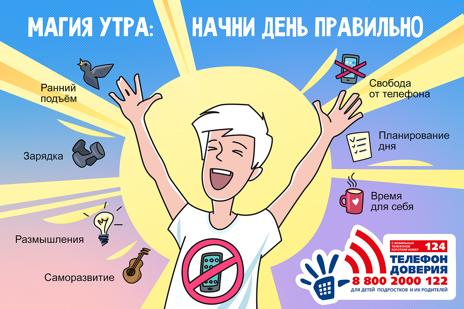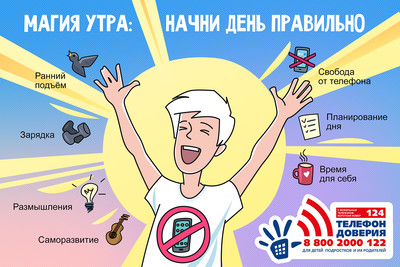 Не бойся вставать рано — утро способно открыть перед тобой новые горизонты и сделать каникулы незабываемыми! Нужен совет – звони на Детский телефон доверия 8 800 2000 122 — бесплатно с любого телефона или 124 — с мобильного – здесь тебе помогут! | |
