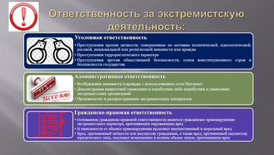За осуществление экстремистской деятельности граждане Российской Федерации, иностранные граждане и лица без гражданства несут административную, уголовную и гражданско-правовую ответственность.